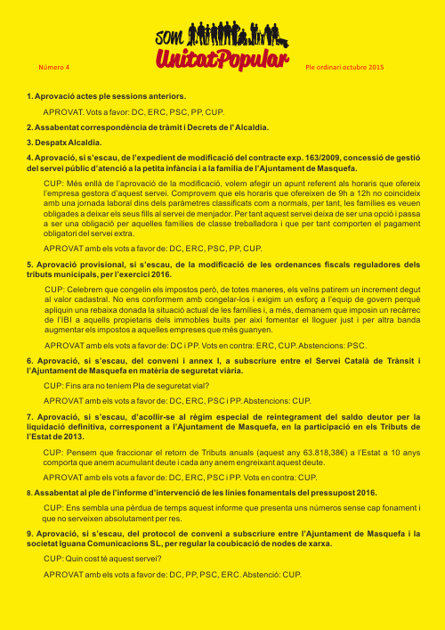 APROVADA amb els vots de: DC, ERC i CUP. Vots en contra: PP. Abstencions: PSC. - Aprovació, si s’escau, de la moció que presenta la Candidatura d’Unitat Popular de Masquefa (CUP-PA) per a la creació d’una brigada de manteniment als barris.